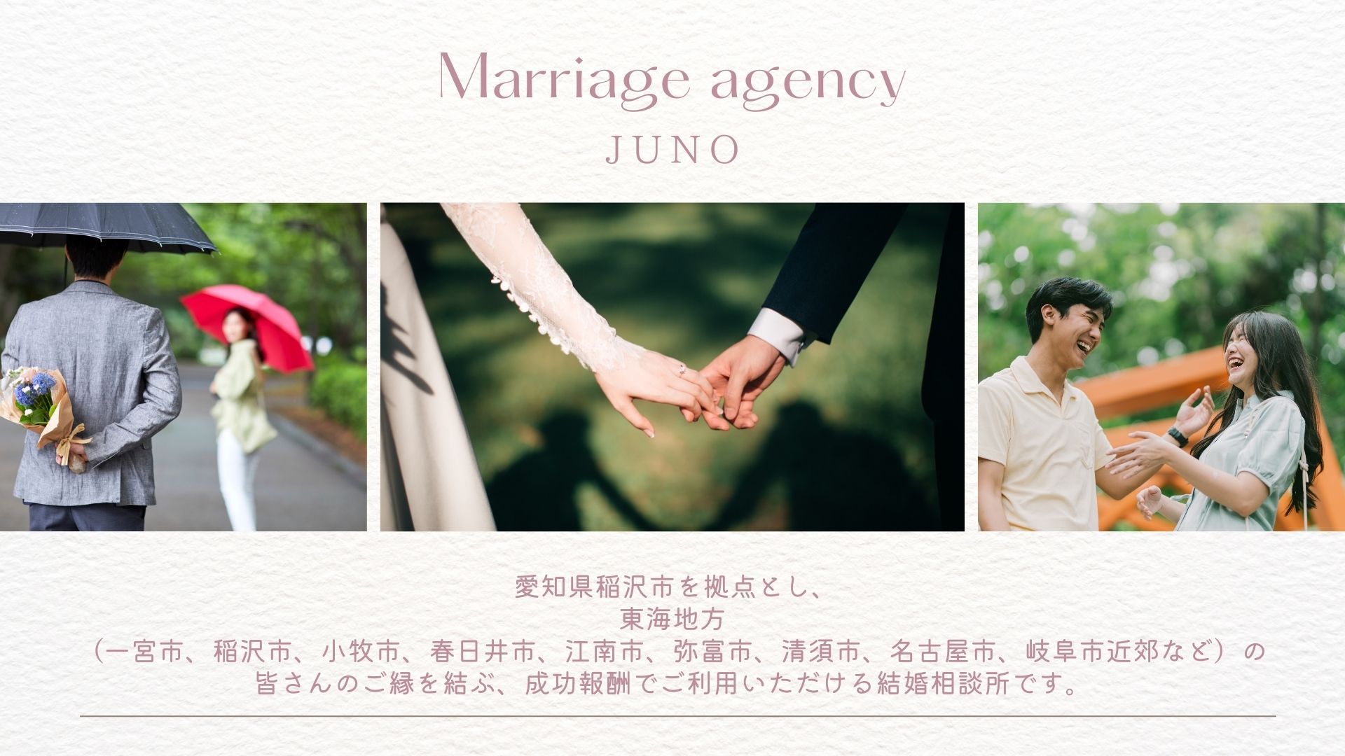 結婚相談所JUNO10:00~20:00稲沢市を拠点にした地域密着の仲人型相談所。経験豊富な仲人が無料出張相談や定期的な婚活パーティーで親身にサポートし、成功報酬制で成婚まで伴走します。月会費(税込) -入会金(税込)33,000円〜詳細を見る公式サイトを見るプラン月会費(税込)期間都度払い情報紹介・推薦プラン(男性)--他2件のプランを見る