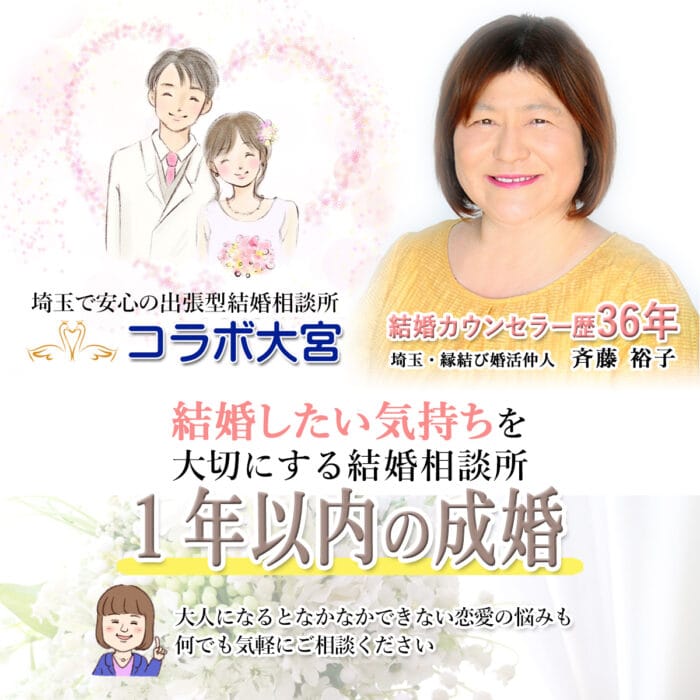 コラボ大宮大宮駅から徒歩4分09:00~21:00仲人・斉藤による親身なマンツーマンサポートで成婚率の高さを実現する大宮の仲人型結婚相談所。出張やホテルラウンジでの個別面談、無料相談、複数連盟登録で幅広い出会いと最短成婚を目指します。月会費(税込)19,800円/月〜入会金(税込)308,000円〜詳細を見る公式サイトを見るプラン月会費(税込)期間要問合せ一括払いコース--他2件のプランを見る
