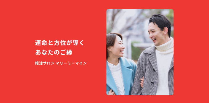 マリーミーマイン夫婦カウンセラーが二人三脚で担当し、手相や方位学を活用する独自メソッドとIBJ会員網で、個別に最適なご縁を見つける小規模サロンです。成婚後は住まいや風水のアドバイスまで継続的に支援します。月会費(税込)5,500円/月〜入会金(税込)33,000円〜詳細を見る公式サイトを見るプラン月額(税込)期間要問合せダブルプラン¥5,500/月-他3件のプランを見る