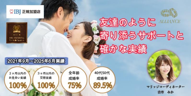 アリヨンス10:00~21:0040代・50代の婚活に特化し、面談を重視して心理学とタロットを用いた個別支援で高い成婚率(85.7%)を実現。月一回の対面またはオンライン面談で継続的に寄り添います。月会費(税込)7,000円/月〜入会金(税込)20,000円〜公式サイトを見るプラン月額(税込)期間要問合せライトプラン¥7,000/月-他3件のプランを見る