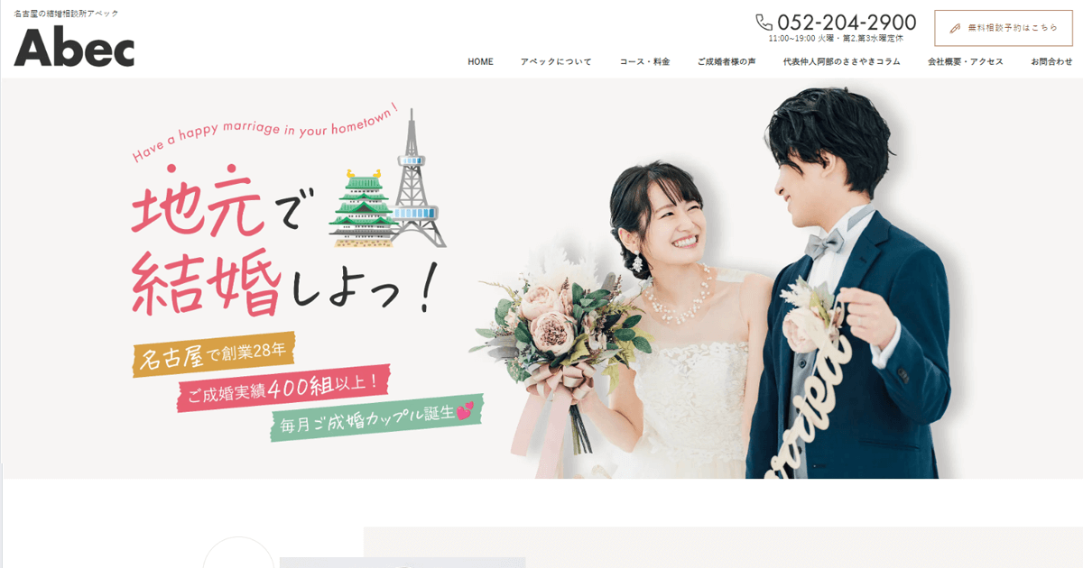 アベック久屋大通駅から徒歩4分11:00~19:00名古屋で28年の仲人型結婚相談所。代表仲人が男女別スタッフでマンツーマン対応し、IBJ等連盟の豊富な会員網と独自ノウハウで短期間にお見合いを実現、成婚へ導く親身で成果重視のサポートが特長です。月会費(税込) -入会金(税込)-詳細を見る公式サイトを見る