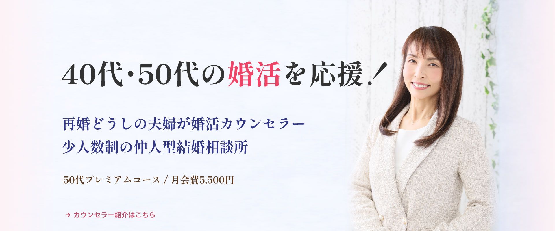 アンジェリク心斎橋駅から徒歩3分10:00~19:0040代・50代のミドル世代に特化した少人数制の仲人型結婚相談所。再婚経験のあるカウンセラー夫婦が専任で寄り添い、写真撮影同行やオンラインお見合い、無制限のLINEサポートで成婚まで伴走します。月会費(税込)11,000円/月〜入会金(税込)33,000円〜詳細を見る公式サイトを見るプラン月会費(税込)期間要問合せ婚活応援コース¥11,000/月-